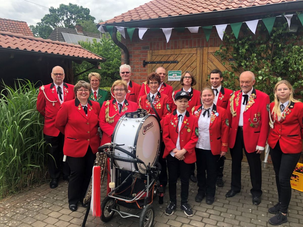 Sonntagmorgen fing bereits um 6 Uhr das Wecken an. Hierzu waren mit Thomas Maya und Sven Höfer auch zwei Trommler aus Hambühren anwesend, um das Spektakel nicht zu verpassen. Während der Fahrt mit dem Trecker durch den Ort wurde fleißig gespielt. Neben den bekannten Stücken wurde irgendwann spontan angefangen „da sprach der alte Häuptling der Indianer“ von Gus Backus zu spielen. Am Anfang noch wild durcheinander wurde es immer besser und zum Ende des Weckens klappte das Stück schon ganz ordentlich. Während einige Musiker bis zum Festumzug am Nachmittag nach Hause gingen, hat der eine oder andere noch auf die Königswürde geschossen.