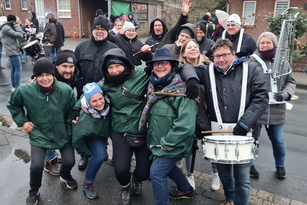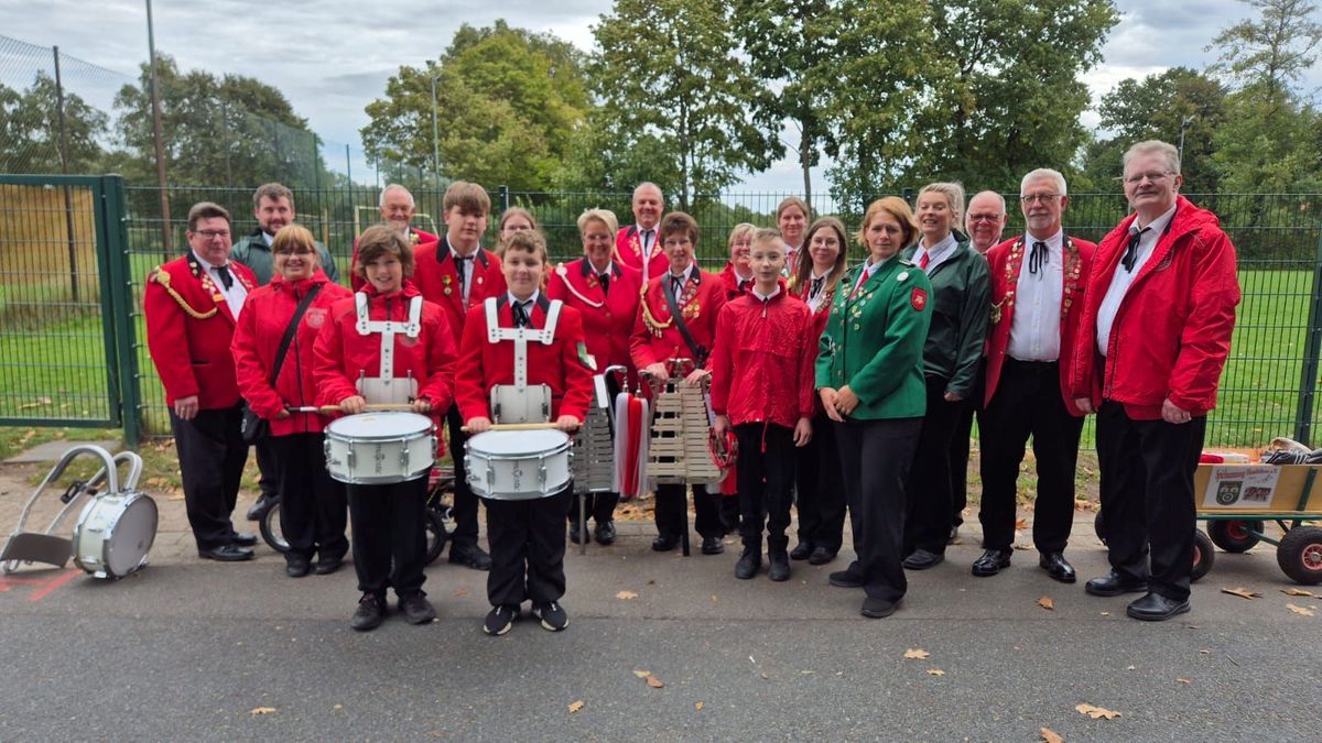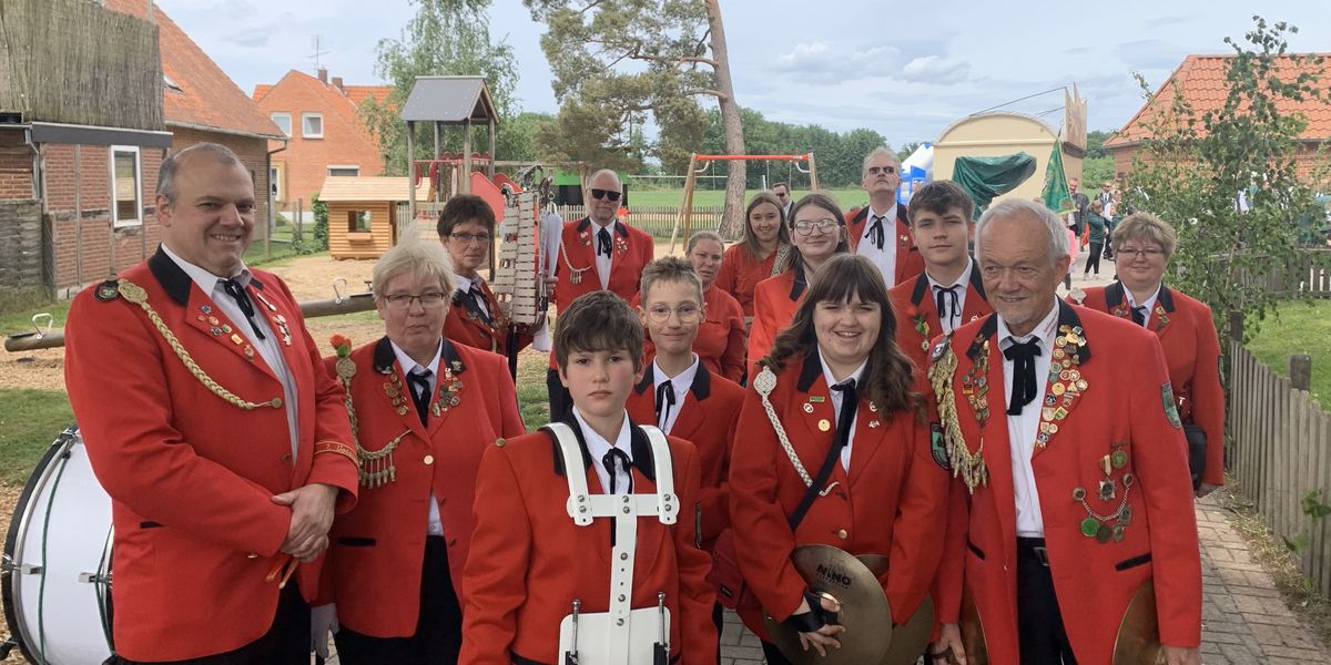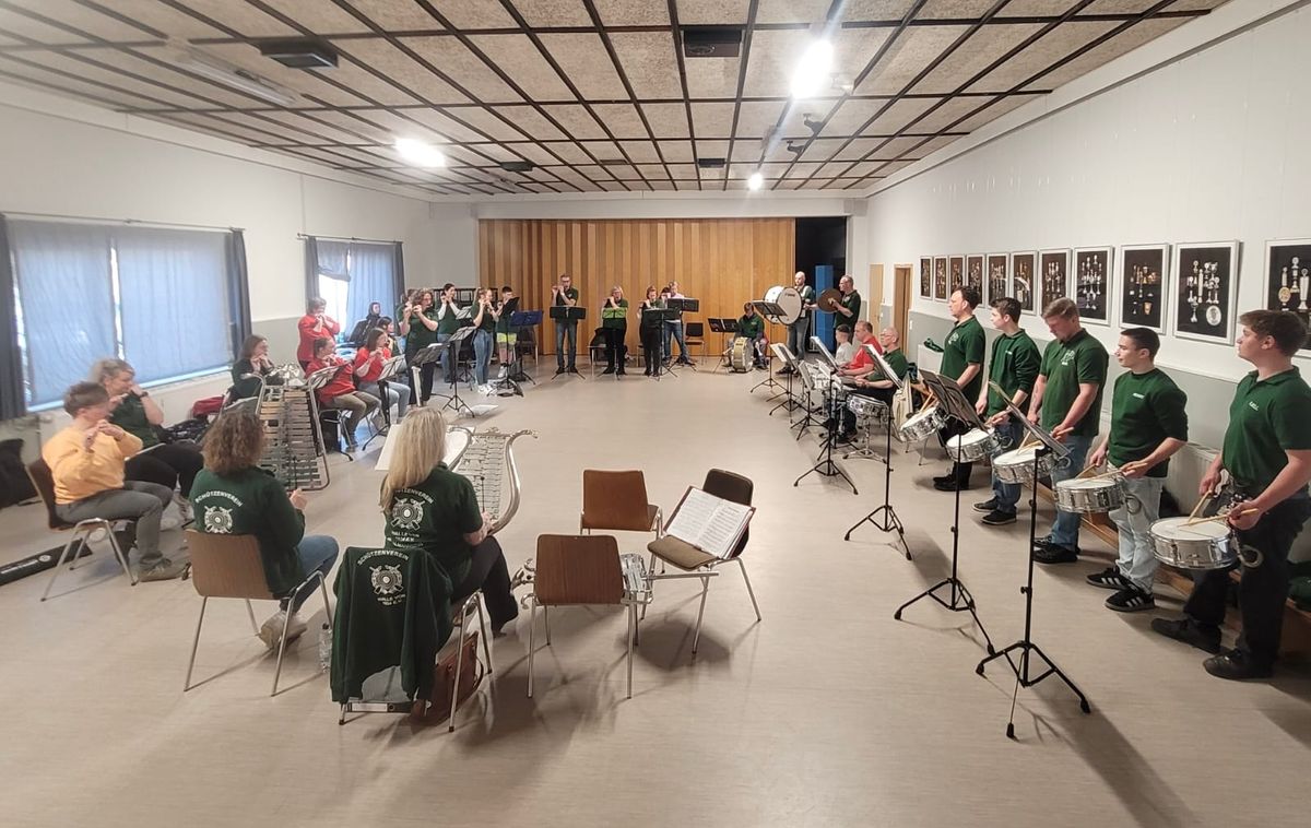 Da sich in den letzten Jahren nach dem Umzug immer mehr Teilnehmer auf dem Platz als im Saal aufgehalten hatten, war der Plan, dieses Jahr draußen zu spielen. Durch den Regen sind wir dann doch im Saal geblieben, um neue und alte Lieder zu spielen. Als wir dann mit Musik nach draußen marschiert sind, wurden wir aufgefordert, auch dort noch weiterzuspielen. Selbstredend haben wir das gerne gemacht und freuen uns bereits jetzt auf den Schützenfestauftakt 2026 an Christi Himmelfahrt in Stöckendrebber.