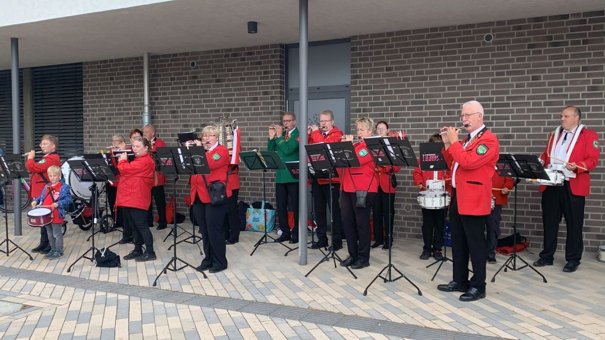 Der Spielmannszug spielt auf dem Parkplatz an der B214