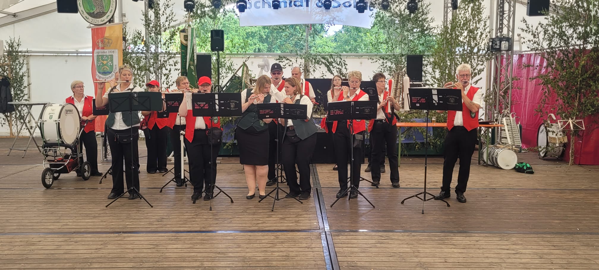 Nachdem der Festplatz erreicht war, ging es direkt weiter ins Festzelt, wo Sitzplätze reserviert waren und Kaffee sowie Kuchen auf uns warteten. Allerdings war für die meisten Spielleute der musikalische Einsatz noch nicht zu Ende. Der befreundete Spielmannszug aus Walle hat zum ersten Mal beim Hachefest in Nienhagen teilgenommen und sich zu den Bühnenspielen angemeldet. Da dort ein paar Musiker gefehlt haben, baten sie um Unterstützung aus unseren Reihen.