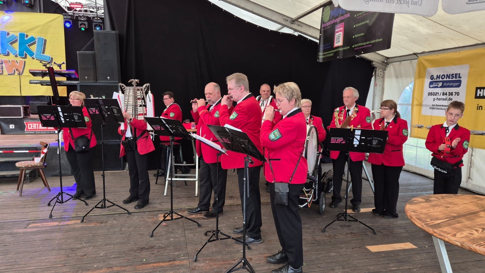 Nachdem der Festplatz erreicht war, ging es direkt weiter ins Festzelt, wo Sitzplätze reserviert waren und Kaffee sowie Kuchen auf uns warteten. Allerdings war für die meisten Spielleute der musikalische Einsatz noch nicht zu Ende. Der befreundete Spielmannszug aus Walle hat zum ersten Mal beim Hachefest in Nienhagen teilgenommen und sich zu den Bühnenspielen angemeldet. Da dort ein paar Musiker gefehlt haben, baten sie um Unterstützung aus unseren Reihen.